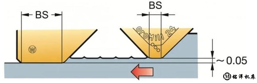 修光刃或長平行刃帶能夠?qū)崿F(xiàn)更大直徑的精加工。修光刃高于標(biāo)準(zhǔn)刀片,從而確保修光刃生成最終的表面。最大fn不應(yīng)超過BS的80%。