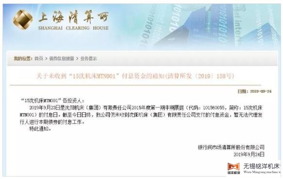 沈機集團(tuán)2015年度第一期10億元中期票據(jù)“15沈機床MTN001”(101560055)的付息日為9月23日,但截至當(dāng)日仍未收到沈機集團(tuán)支付的付息資金。