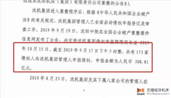 此后不久,8月16日,沈機集團(tuán)下屬的*ST沈機也同樣進(jìn)入破產(chǎn)重整,法院指定沈陽機床股份有限公司清算組擔(dān)任沈陽機床管理人。